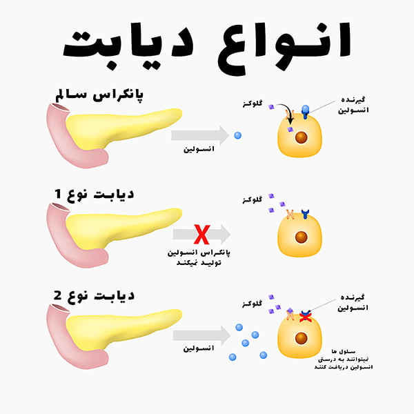 انواع دیابت دیابت به دو نوع اصلی تقسیم میشود: 1. دیابت نوع 1: در این نوع، بدن قادر به تولید انسولین نیست و بیماران نیاز به تزریق انسولین دارند. 2. دیابت نوع 2: در این نوع، بدن به انسولین پاسخ نمیدهد یا تولید آن کافی نیست. این نوع معمولاً با تغییرات سبک زندگی و داروها مدیریت میشود.